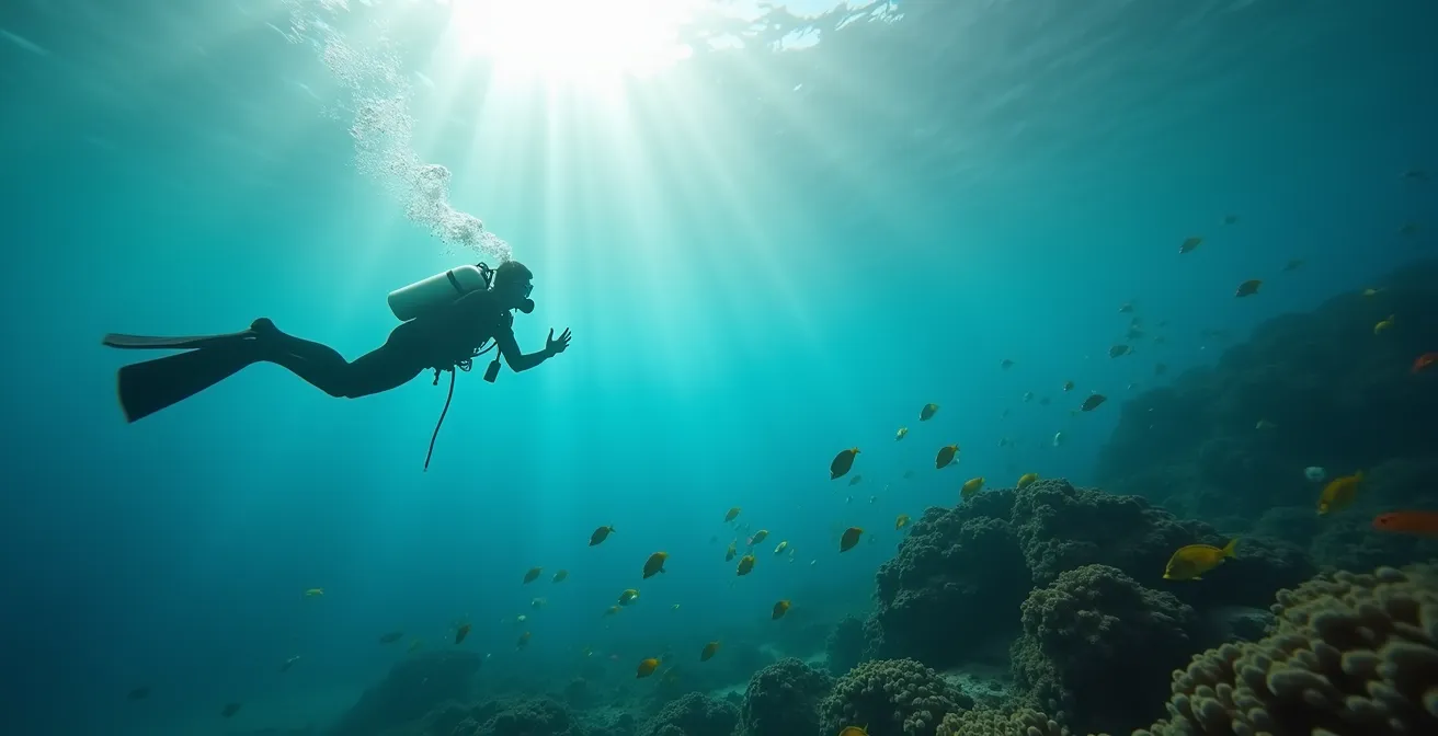L’appréhension avant un baptême de plongée est normale, surtout face à l’inconnu du monde sous-marin. Plutôt que de simplement vous dire de ne pas vous inquiéter, ce guide déconstruit chaque peur potentielle. En comprenant la pédagogie spécifique des moniteurs réunionnais, la logique derrière les règles de sécurité et le comportement réel de la faune, vous transformerez l’anxiété en une confiance active. L’objectif n’est pas d’ignorer la peur, mais de l’apprivoiser par la connaissance pour vivre une première immersion sereine et véritablement magique.
